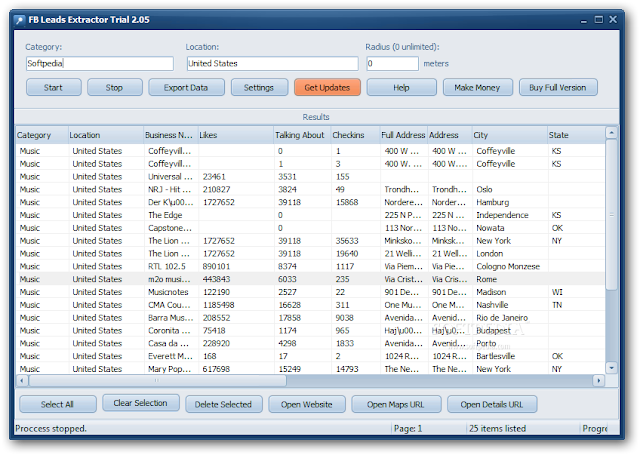 While performing the search, the tool displays a list of results, and populates it as the process advances. Results are initially displayed in the order they were found, but users can also have them sorted alphabetically or in accordance to various other criteria.FB Leads Extractor is a tool that searches business leads and competitors in Facebook and extracts important information like business name, address, phone number, websites, number of likes, number of checkins, Facebook details link and other important information.